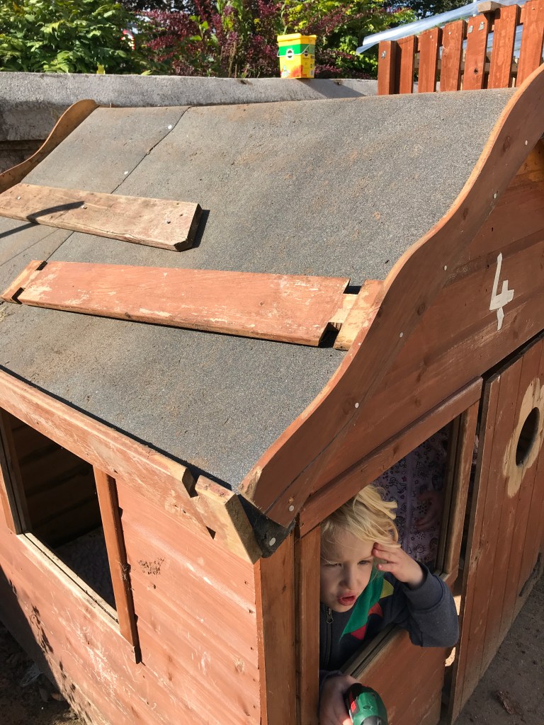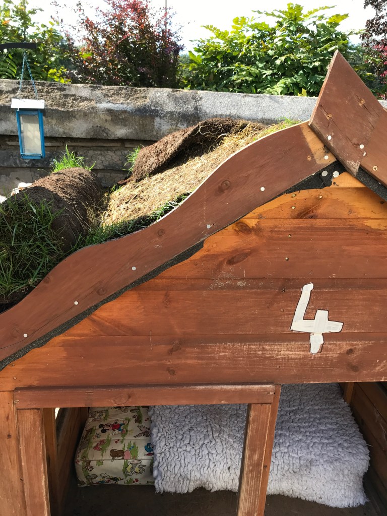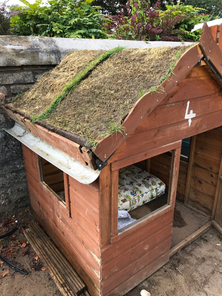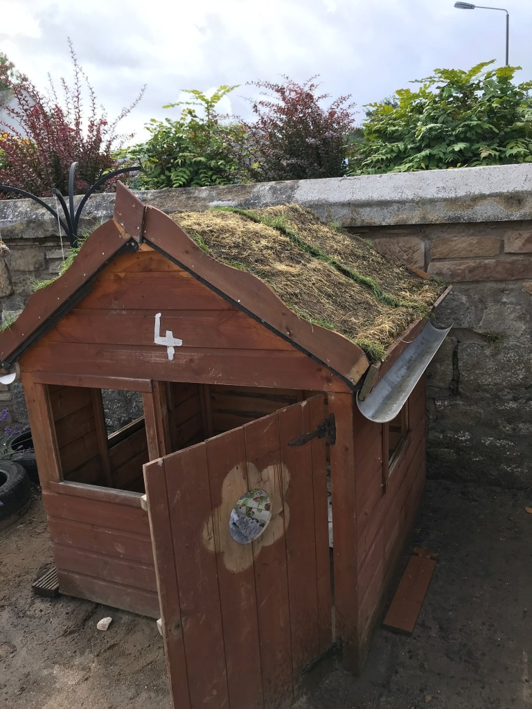 We were given some spare rolls of turf and decided to give our playhouse a living roof. Hopefully it will add some more colour and interest to our garden.