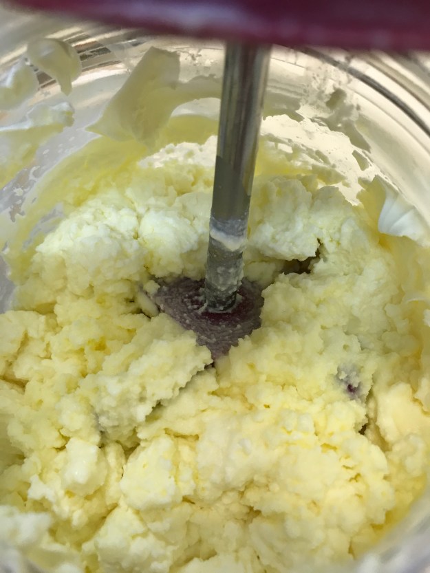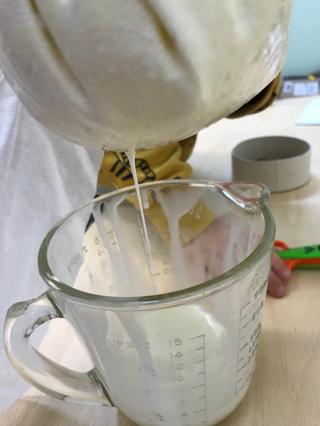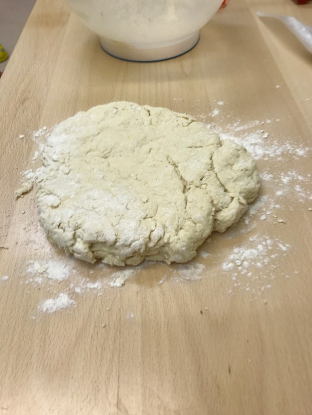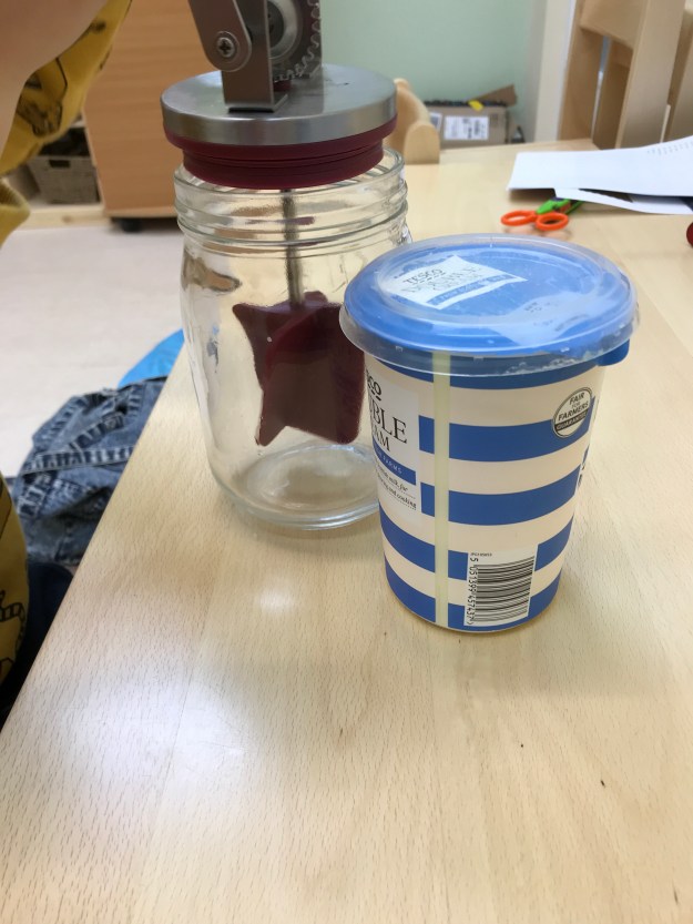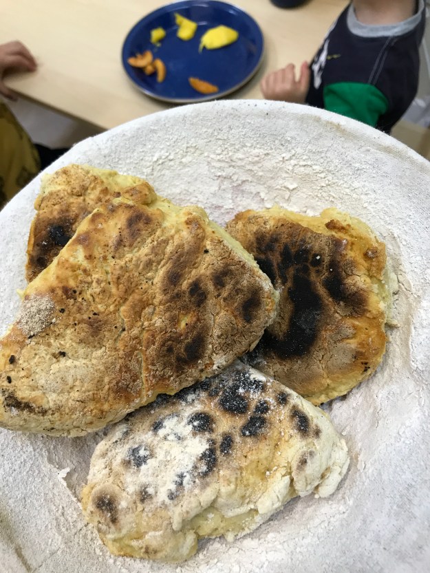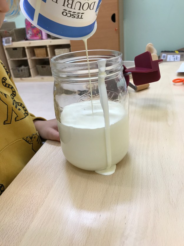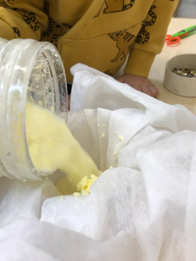 We are gearing up for our (not too) grand opening ceremony and today the children made some butter to serve with our hedgerow jam. They were very enthusiastic about pouring the cream into the butter churn and starting to turn the handle but found that their arms got tired very quickly. Churning butter is hard work! Fortunately some good turn taking allowed us to keep going until we had some lovely creamy butter. The buttermilk left was too good to waste so we made a batch of girdle scones with it to eat with our lunch.