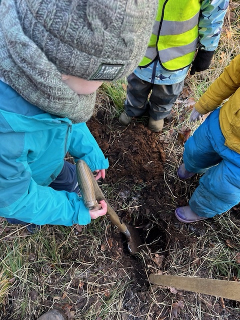 Despite the frosty weather and some hefty tree roots our children worked hard to dig holes deep enough to make sure our little tree roots could spread and grow. We are grateful to Angus Elliott for helping us find the best place and for putting in stakes and tree guards to protect our baby trees from the deer and rabbits. We are looking forward to watching our trees grow! We wonder how long it will be before they are taller than we are!