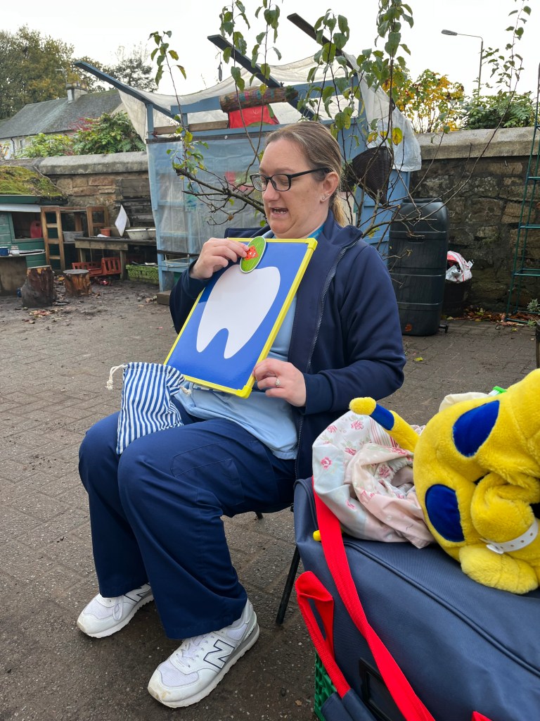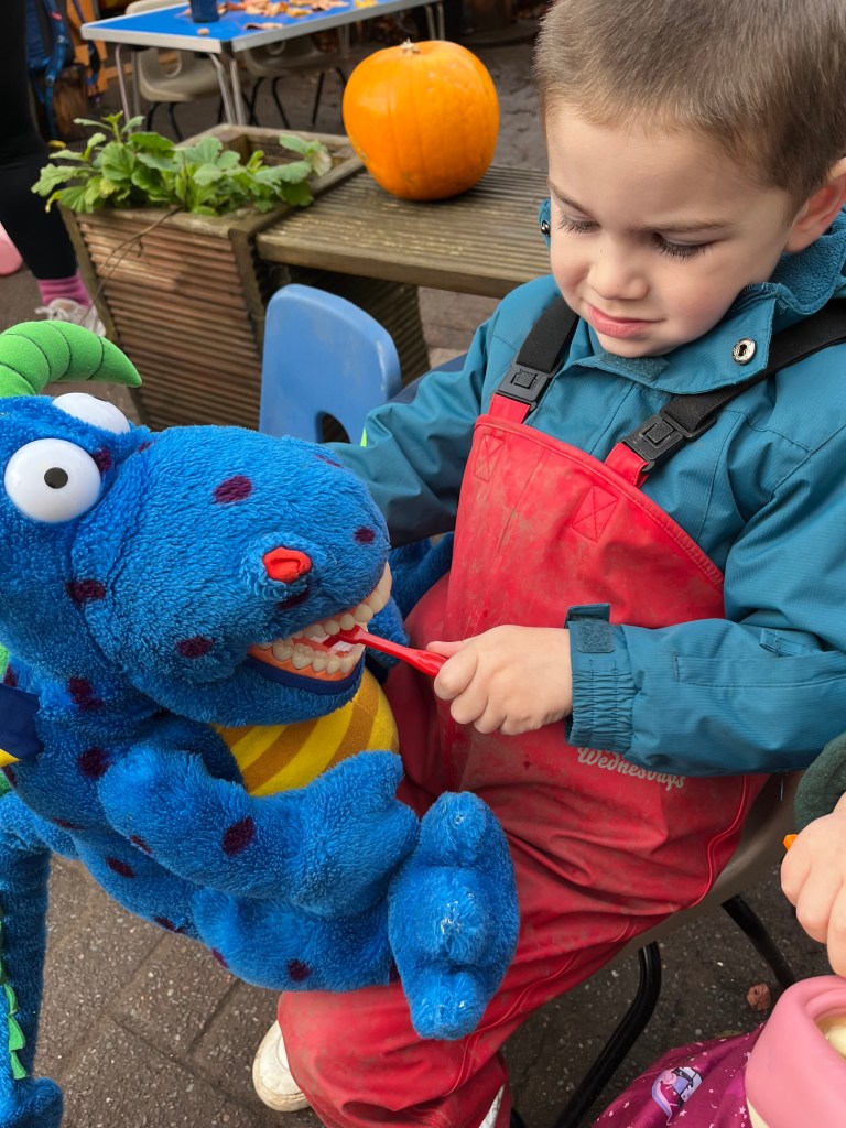 We’ve had a very busy first week back at nursery following the October holiday. We’ve been very pleased to welcome Lisa to our staff team and she has very quickly settled in and is getting to know all of our children and families. We had a visit from another Lisa, this one our friend from Childsmile and she brought along some of her puppet friends and our children took turns to practice their toothbrushing skills. Lisa also brought along some toothbrush cases for us so we will be able to take our toothbrushes to the woods with us.