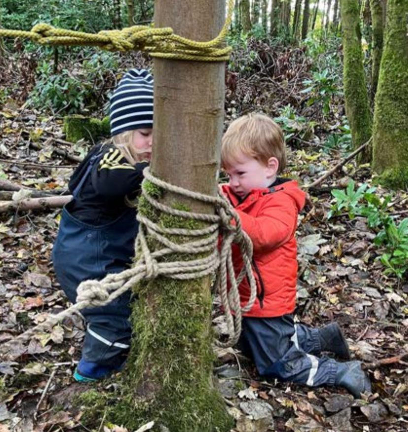 We have been busy in the woods marking out a boundary on our woodland site and learning how far we can roam when we are playing. Over recent weeks our children have all been very engaged in tying knots with rope and last week with wool in our spider web. This week they practised enthusiastically with a new material, boundary tape.
