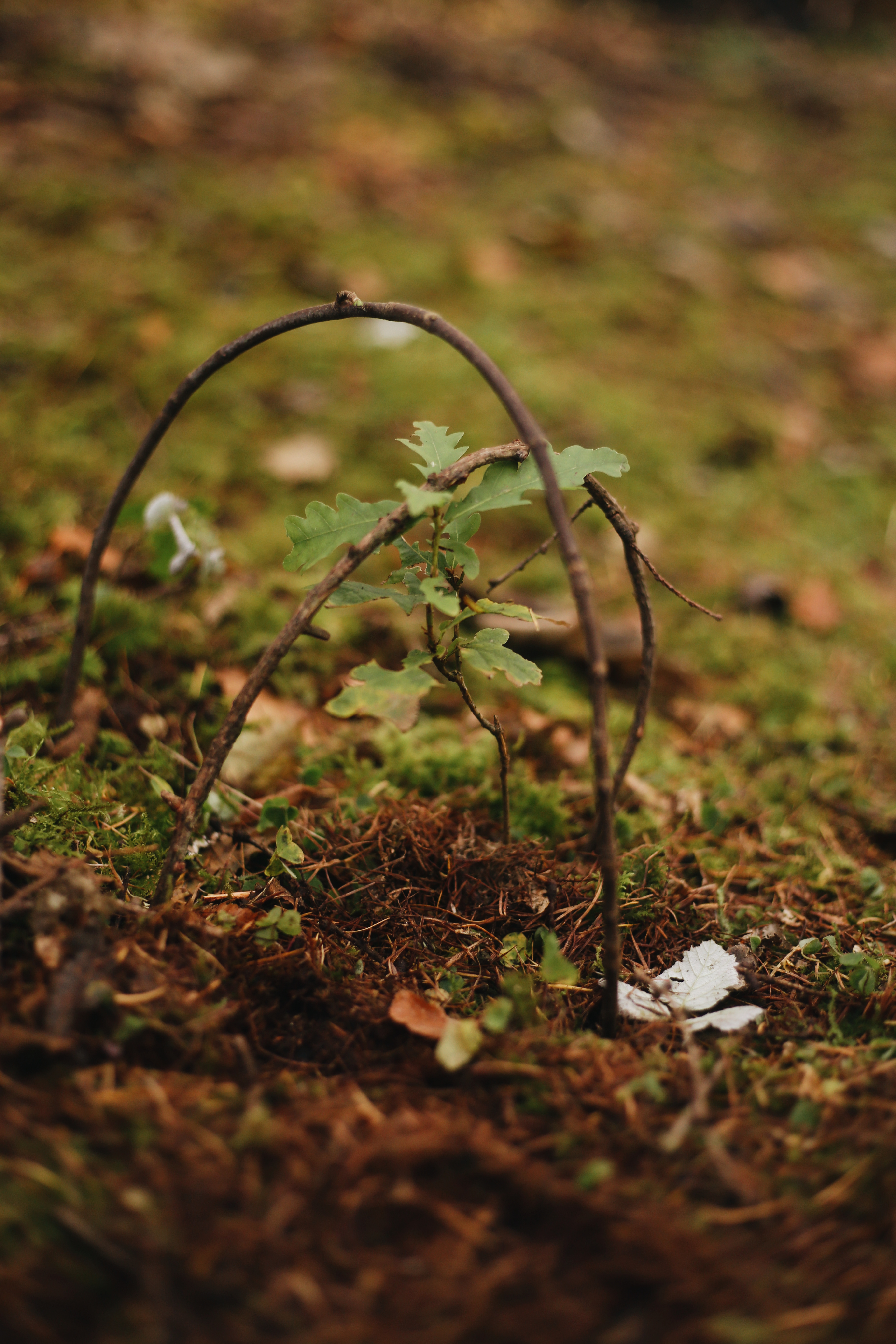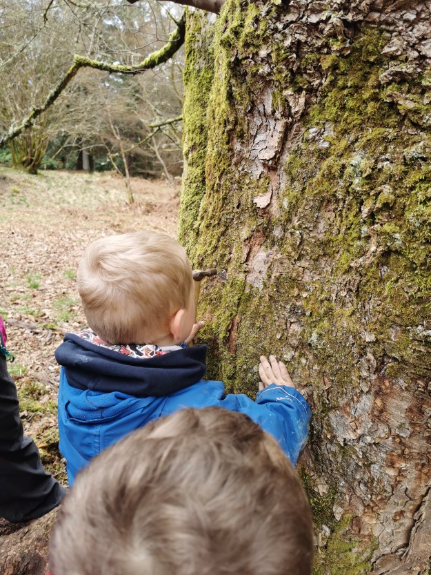 In the woods today we were building on the interest the children have shown in finding and collecting acorns. Yesterday we learned how to identify an oak tree by looking at the shape of its leaves. Today we walked through the woods and tried to spot more oak trees. We were excited to find a tiny little baby oak (we put sticks around it to protect it because we were worried someone might stand on it) and also an enormous oak tree that took 4 children to stretch their arms around it. We learned that oak trees are known as the King of the Forest and that they grow very slowly but are very strong. Jane, Jordan and Lynda also learned that oak trees produce male and female flowers – the male flowers develop in a group called a catkin. Catkins hang down from twigs and release their pollen into the air where they are blown around to pollinate a nearby female flower. After pollination, the base of the female flower forms a woody cup, and the flower forms a woody fruit called a nut – an acorn!