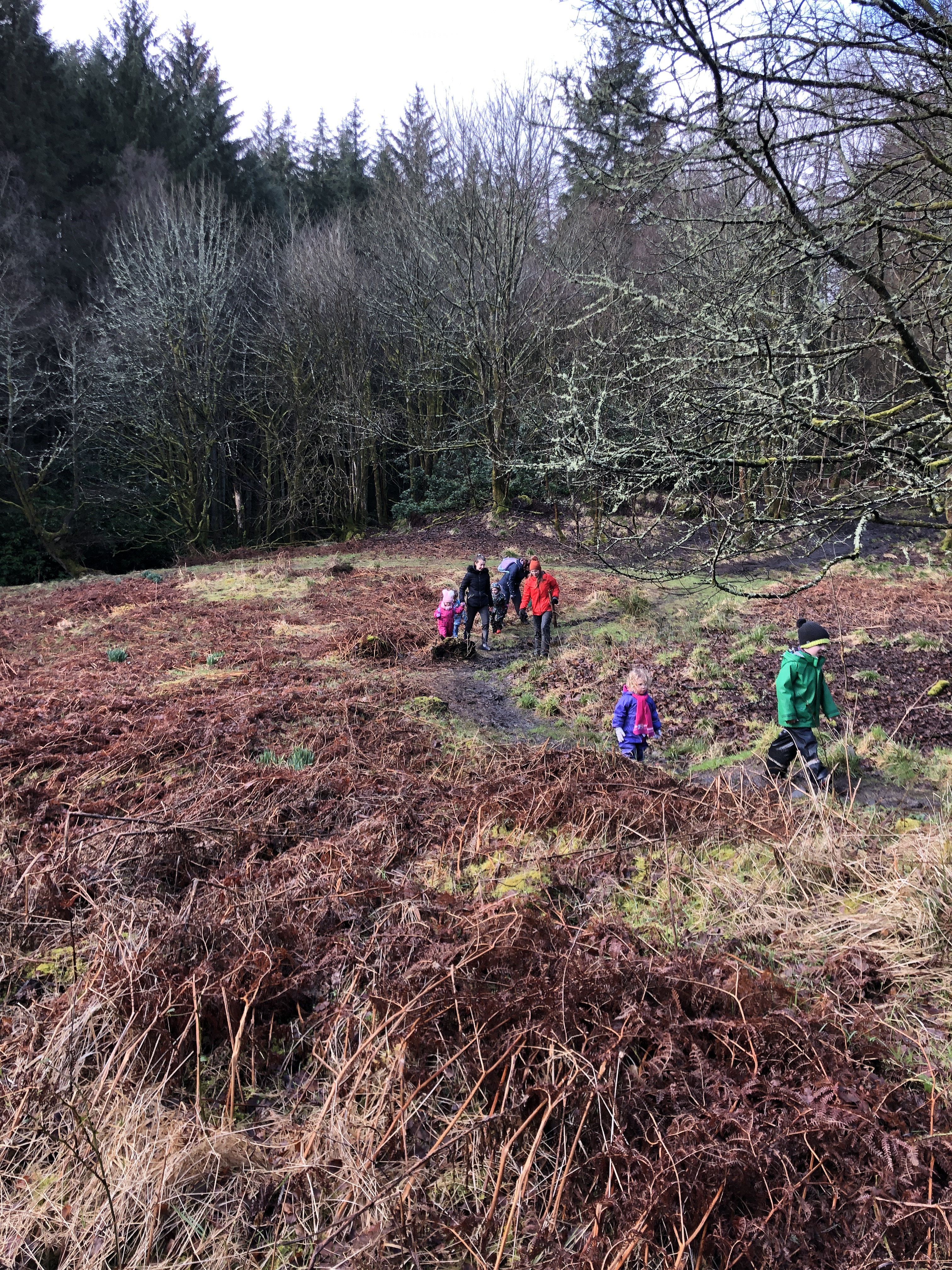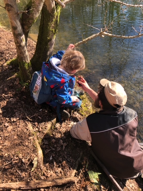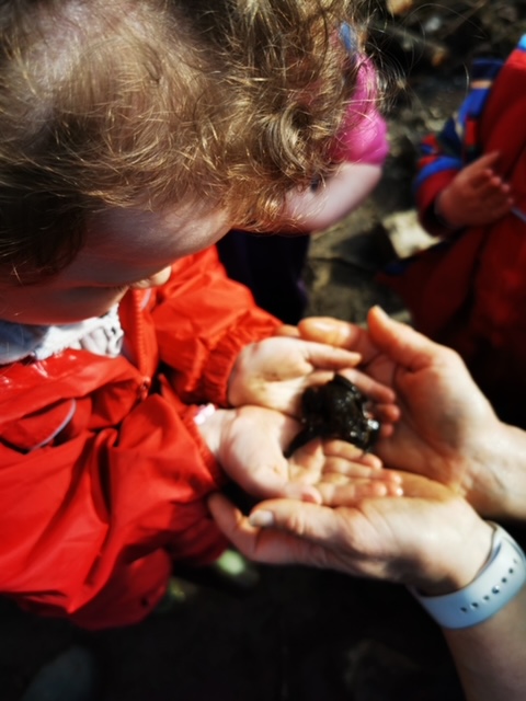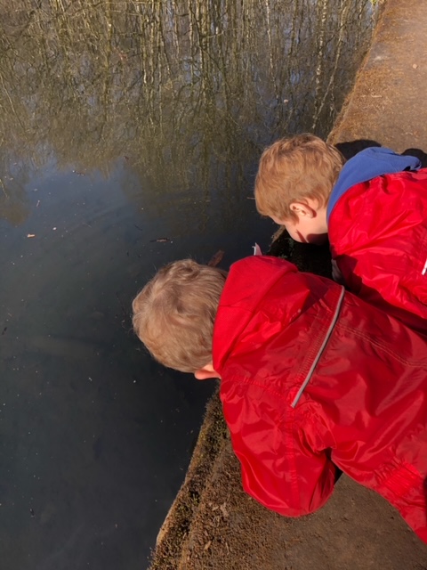 We spent the morning exploring the woods today. We walked to the Walled Garden, along to the Curling Ponds (where we found frog spawn!) up to the Swimming Pool and back down through the Dark Woods. It was pouring with rain most of the time and so we enjoyed lots of splashing and stomping in muddy puddles.