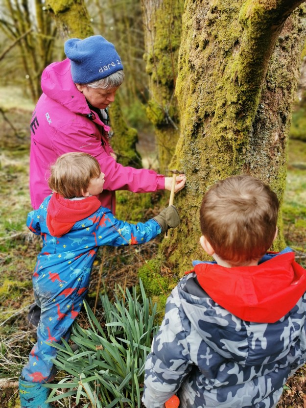 We had an important job to do today in the woods, and, for the adults, a significant one. Today, we labelled the trees on our site so they could be points of reference for future work. This was the first proper marking of our site, and although there is a long, long way to go, we now have a visible and obvious mark of our intent. The children chose to label their favourite climbing tree number 1 (technically it is 0001) and then worked with great perseverance and dedication to label other surrounding trees. It was so fitting that our children could not only take part but lead in this big step towards developing our woodland nursery.