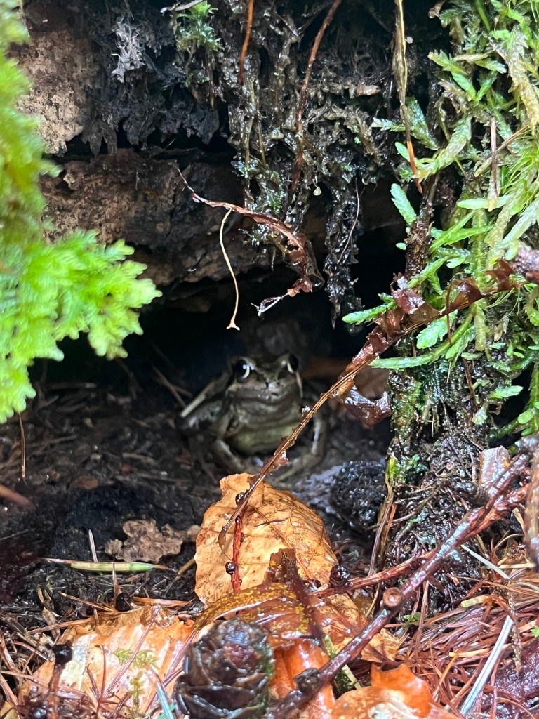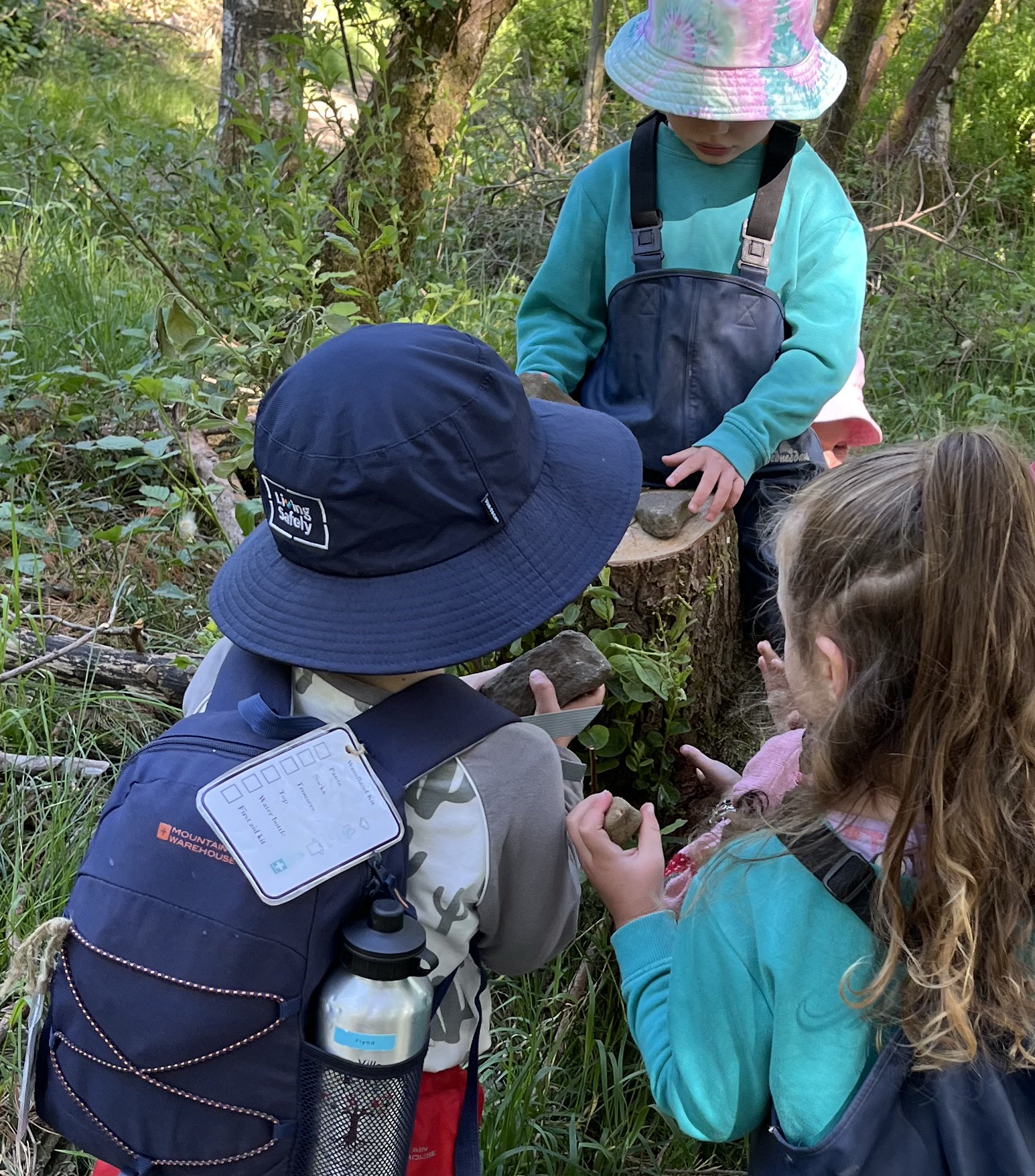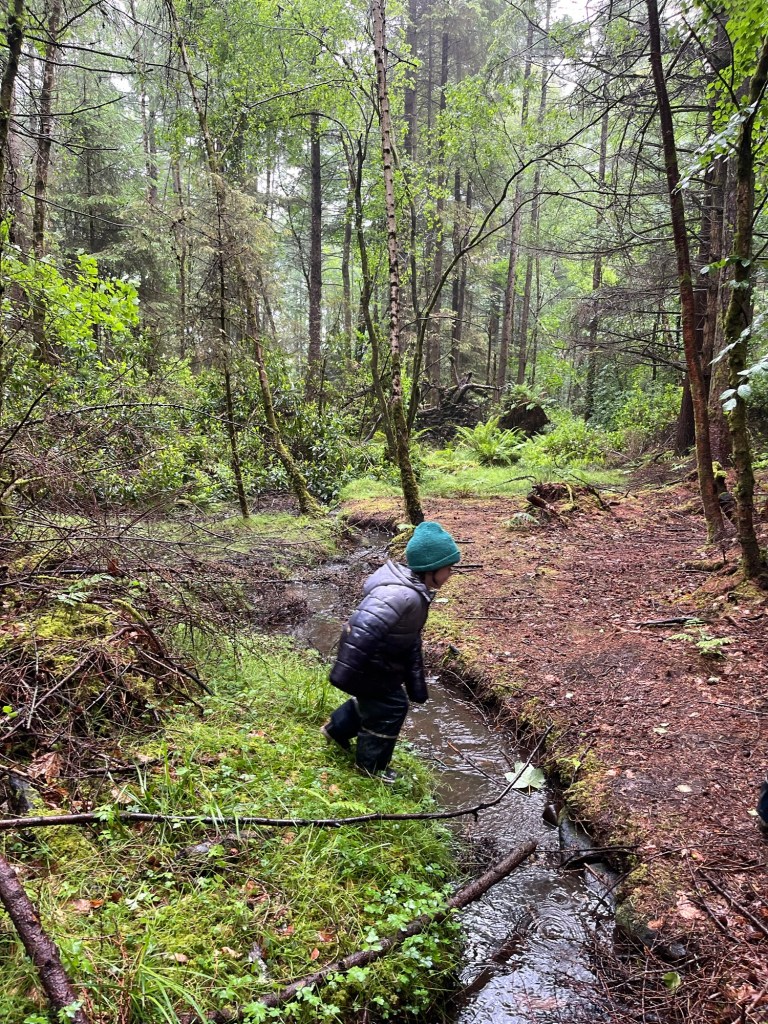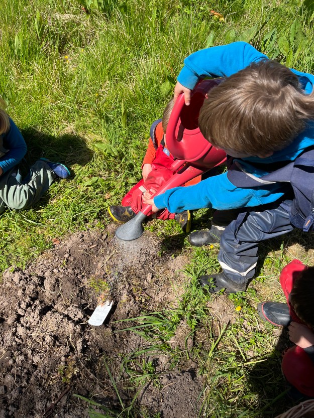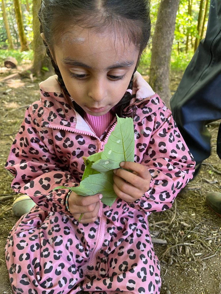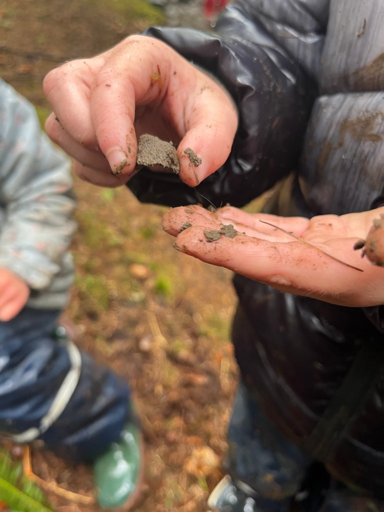 The children also have a strong interest in a big Douglas Fir tree we pass on our woodland journey. Many can already recognise its cones with their “mouse footprints.” This week they spotted a tiny Douglas Fir sapling growing nearby. They decided to measure it and plan to keep observing it over time — an early step into scientific enquiry and understanding how living things grow.