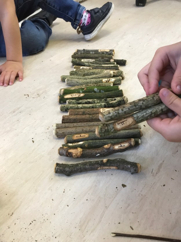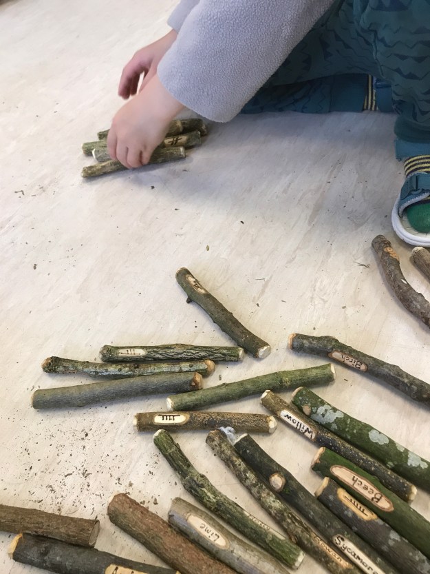 Today our children were engaged in sorting sticks and matching the different kinds of wood. Some of the sticks were marked with the ancient Celtic Ogham alphabet and some with the English name and so we tried to work out which sticks matched. The bark and markings on some of the wood were quite different.